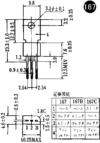 | 2SC1589 | " | " | " | 36 | 4 | 700 | 2.5W(Tc=25゚C) | 150 | 15-200 | 10 | 300 | 700* | <15 | 167B | |