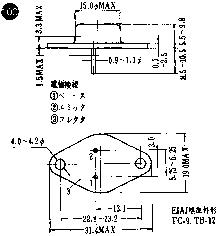 | 2SD13 | " | " | " | 35 | 4 | 10A | 100W(Tc=25゚C) | 150 | 40 | 10 | 2.5A | 109 | |||