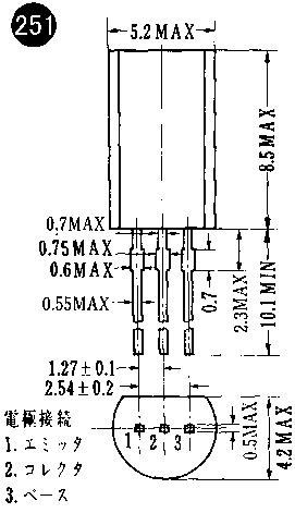 | 2SD952 | " | " | " | 1500 | 5 | Icp 5A | 70W(Tc=25゚C) | 130 | 4-12 | 102 | 水平偏向用 ダンパ内蔵 | ||||