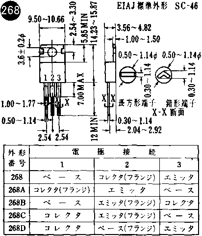 | 2SD991 | " | " | " | 300 | 7 | 6A | 50W(Tc=25゚C) | 150 | >500 | 2 | 4A | 268 | ダンパ内蔵 | ||