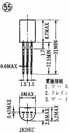 | 2SK55 | " | " | " | -18 | GDO | 150 | 125 | 3 | 14 | 10 | 3 | 8 | 10 | " | 3 | 0.4 | 0.6 | 37A | 2SK55 | ||||