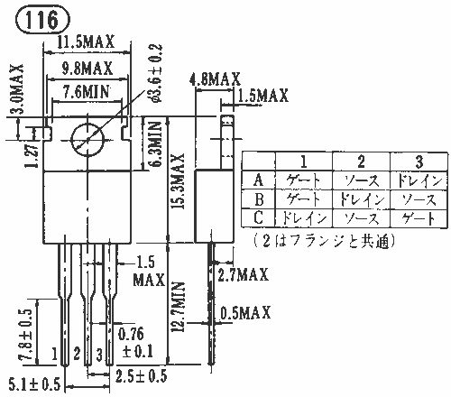| 2SK215 | " | LF PA, HS PSW | " | 180 | DSX | 500 | 30W | 150 | 40 | 20 | 10 | 90 | 2.2 | 2SJ78とコンプリ | 116A | 2SK215 | |||||||