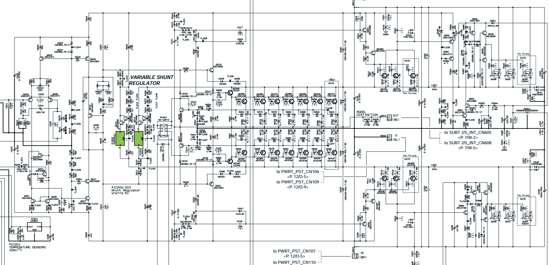探すとサービスマニュアルもあって、自作で同じような回路を試している人達もいるようである。T5Nも同様の回路を採用しており、比較的見やすいので上げてみる。 右上がスイッチングの部分で、電圧生成にシャントレギュレータ(NJM431)を使用するのはパワーアンプではあまり見かけないが、そういうのもありなのかと思わせる回路である。