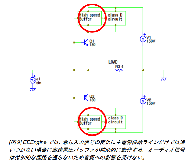 アンプのタイプには、A級、B級、AB級、D級、G/H級と様々なタイプがあり、EEEngineはそれらを組み合わせるタイプの回路になる。YouTubeに回路動作時の波形を記録した動画があり、それを見ると一目瞭然である。